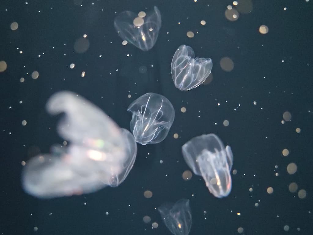 スマートフォンで撮影した、クラゲと餌が手前ボケになっている写真