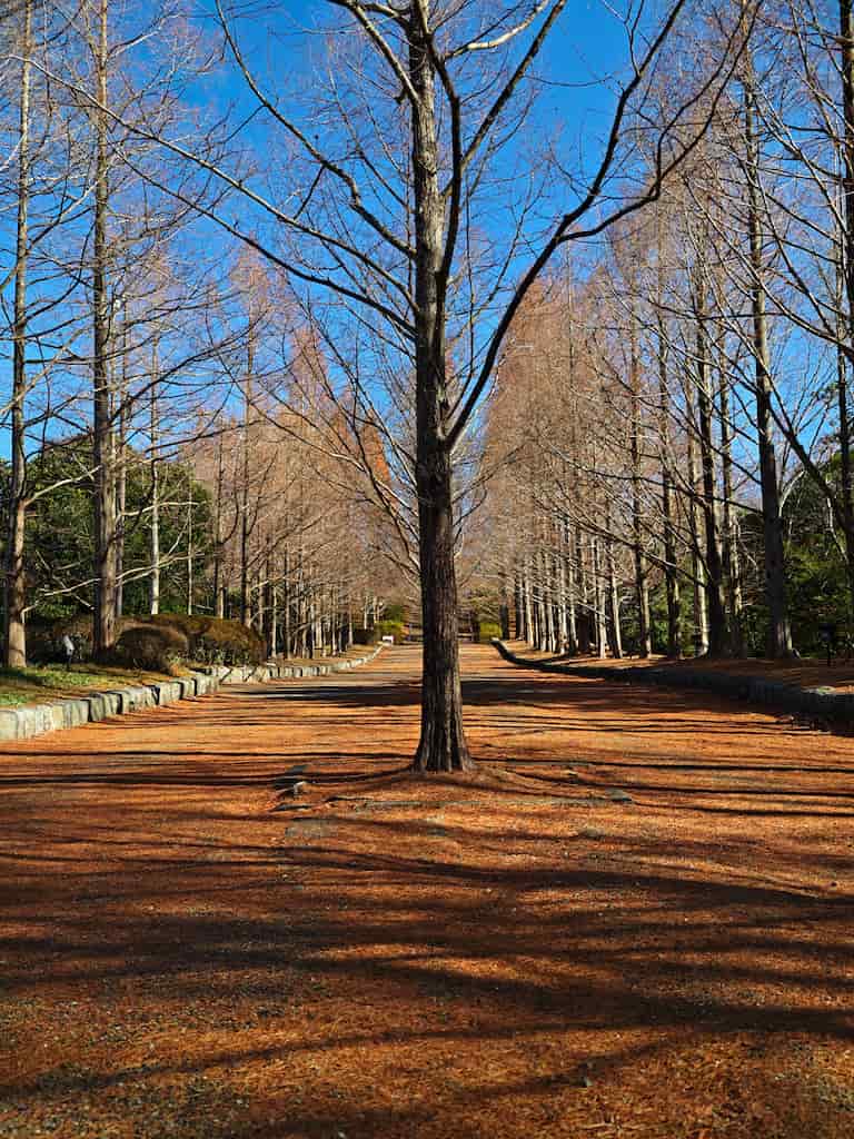 駐車場停めてすぐのメタセコイア並木。紅葉シーズン完全に過ぎてるーー!!